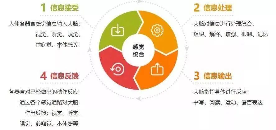 大腦各個階層的神經系統,將來自身體內、外的感覺刺激進行分析處理,并對被大腦注冊的感覺刺激信息加以解釋和理解,并使身體做出適應性反應的過程。